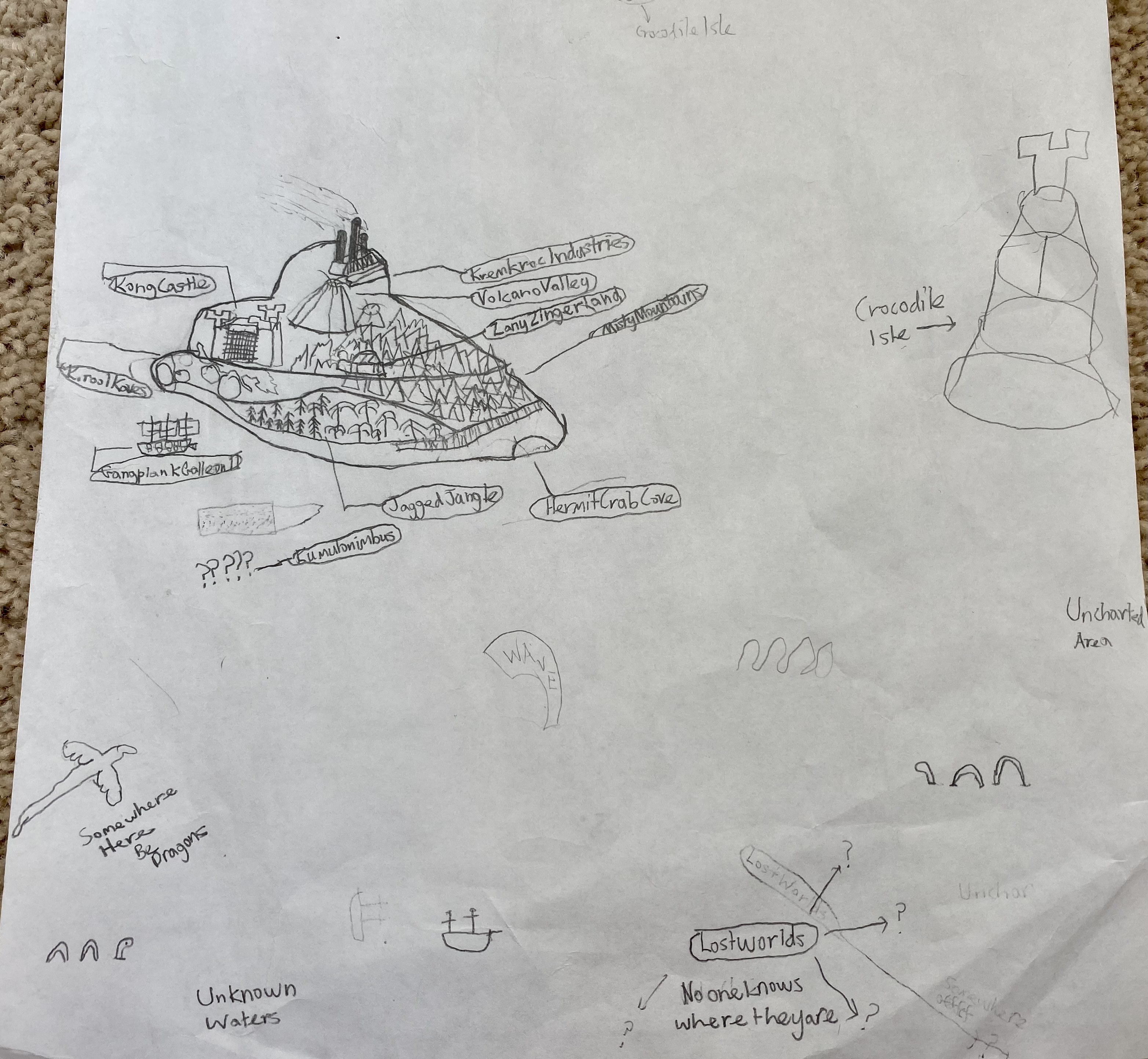I do have a rough sketch of the world map which takes place on the other side of DK Island.