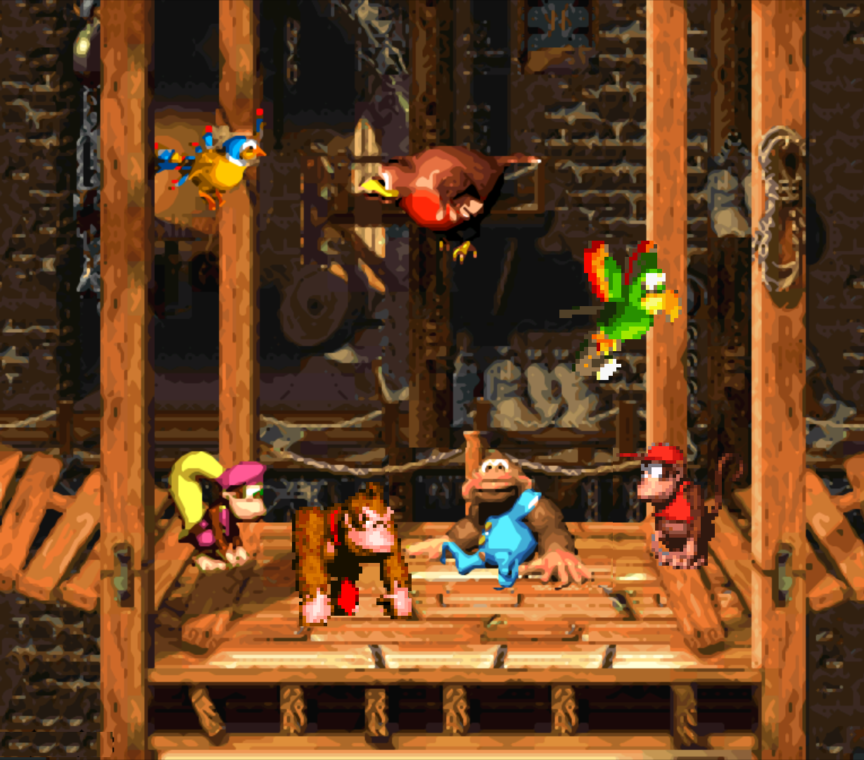 Updated: I messed around a bit, but Squawks might make it too busy, and I think that he's off in scale. I think there needs to be more, but maybe I need to start over? Dixie and Kiddy still look funny due to the filter on in the emulator.