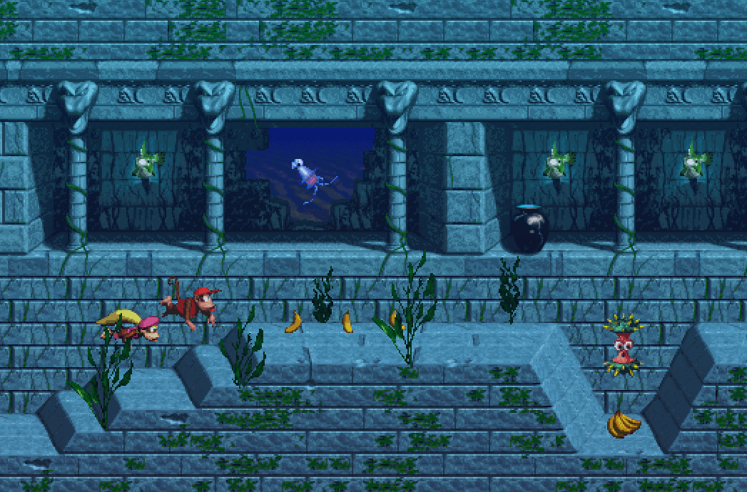 Several things are going on here. I would like this to feature that Clambo animation I'm still working on. Since the temple originally had the fire torches, I'm actually keeping that with a slight twist... over top of the fire itself, a greenish glimmer will be placed. I originally thought of that glowy fish from DKC3, but I liked the way glimmer looked better (I think he also makes a better statue). The green glimmer is just a statue that faces front. I like the seaweed from DKC3, so that would be great if it could be added into the level.