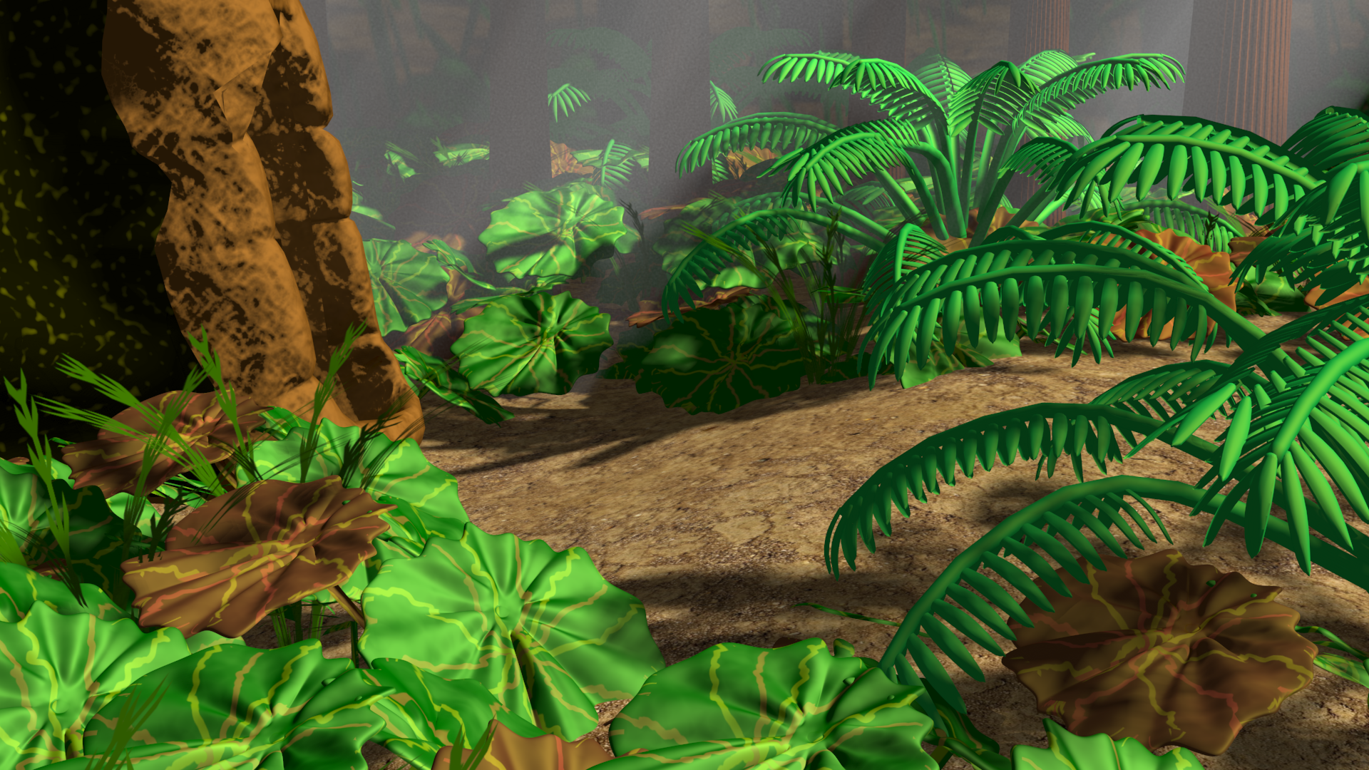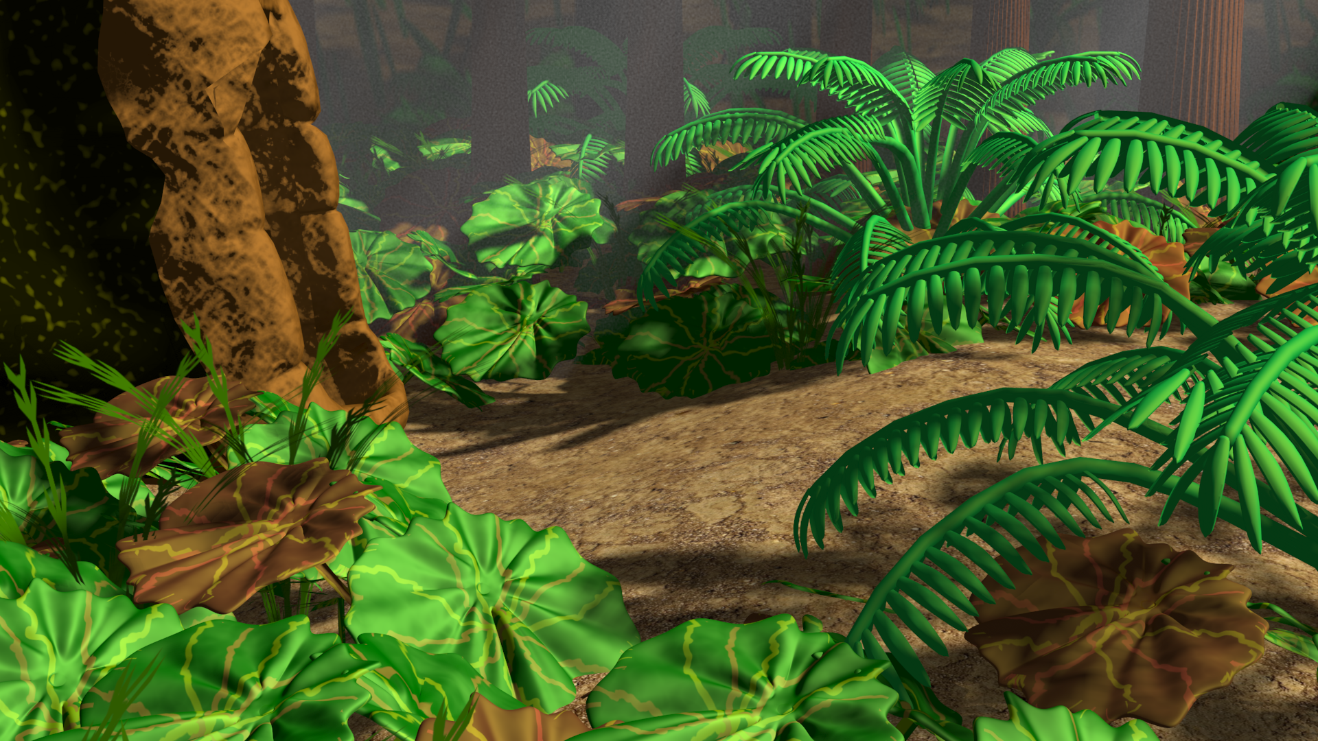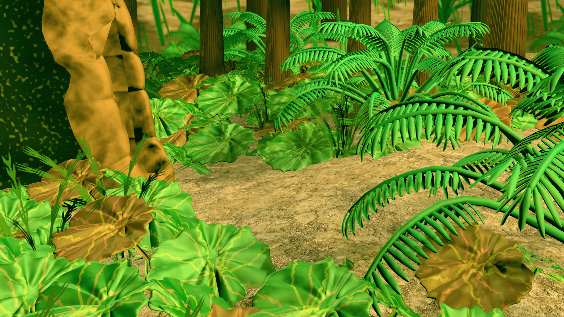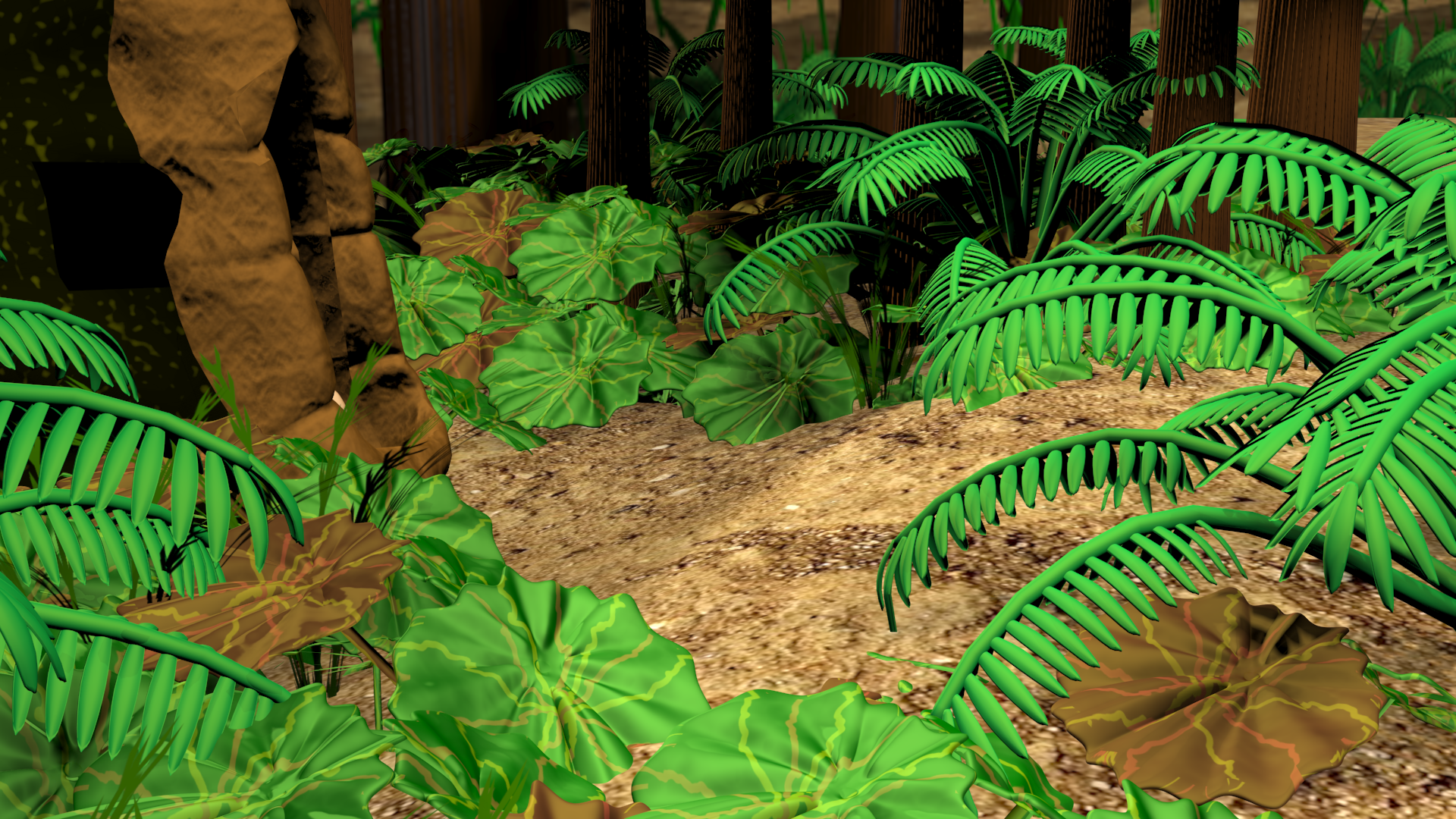 Here is a render with added textures to the ferns. They are a little darker now. should I increase the greenness of the ferns and make them brighter?